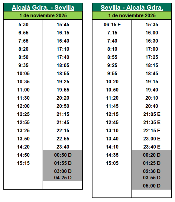 El día 1 de Noviembre de 2025 por la Festividad del Día de Todos los Santos, todas nuestras líneas tendrán horario habitual de festivos, excepto Alcalá de Guadaíra que tendrá servicios nocturnos especiales que se indican aquí abajo:
