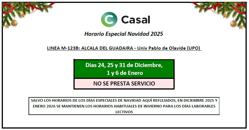 La línea M-123B Alcalá Gdra. - UPO no prestará servicios desde el día 22 de diciembre de 2025 hasta el 6 de enero de 2026 por no ser período lectivo.