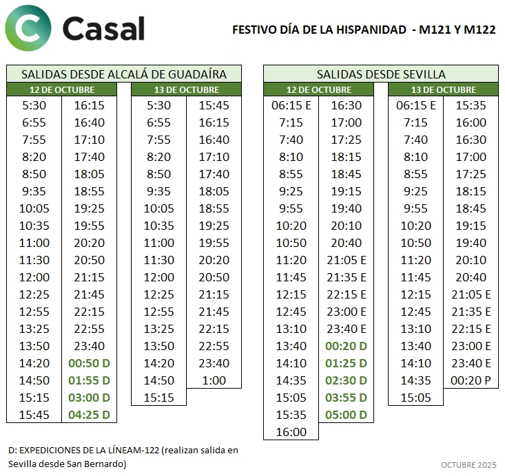 El día 12 de Octubre de 2025, todas nuestras líneas tendrán horario habitual de domingo y festivos, excepto la línea M-122 que aumenta horarios nocturnos (véase más abajo).