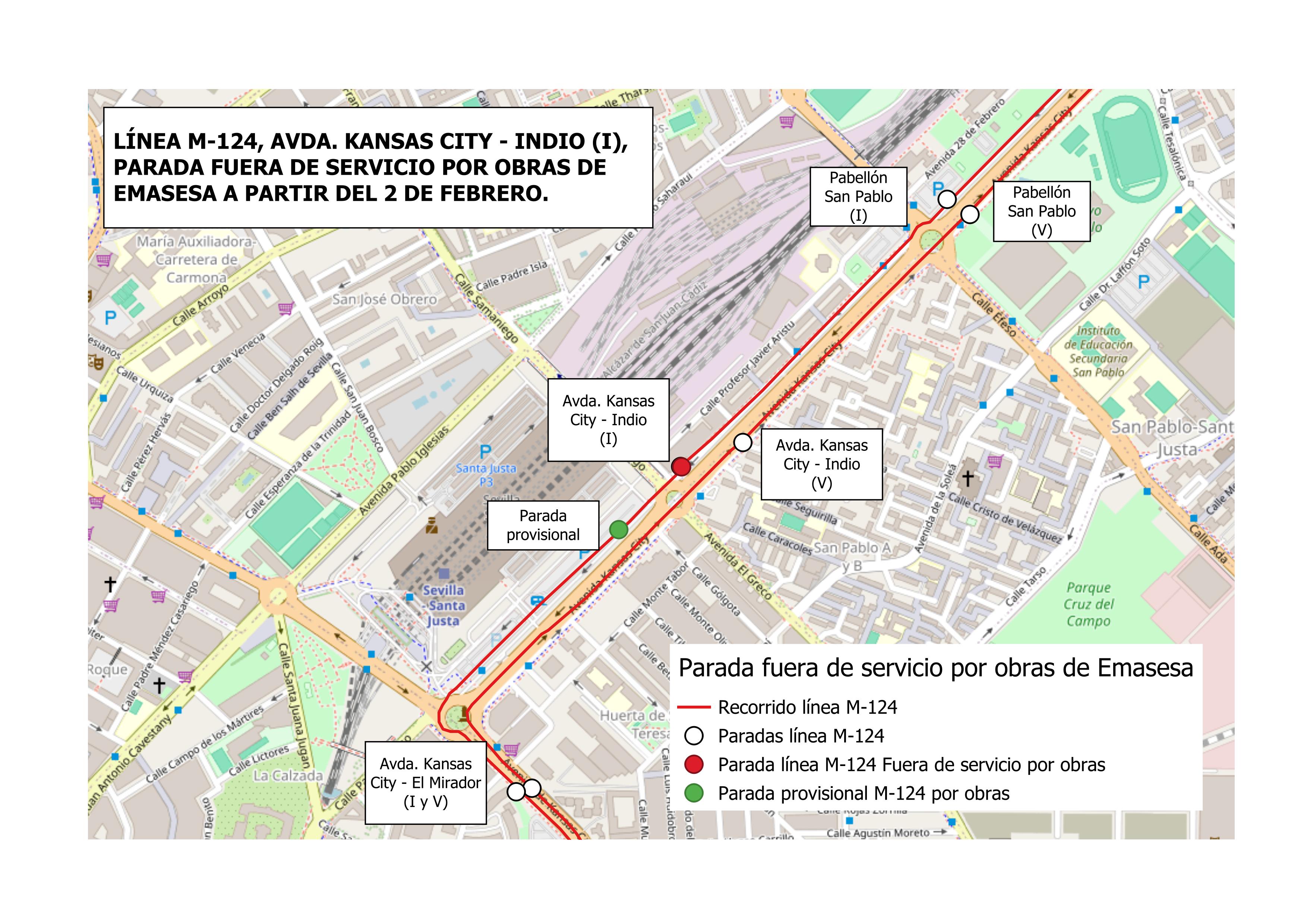 Con motivo de las obras que Emasesa llevará a cabo en la localidad de Sevilla, en la vía de servicio de la Avda Kansas City, si bien no afectará al recorrido de la línea M-124, la parada ubicada en la misma denominada “Avda. Kansas City – Indio, quedará fuera de servicio a partir del 3 de febrero, trasladándose provisionalmente unos 100 metros más adelante. No obstante, hay que indicar que esta parada es exclusiva de bajada en sentido Carmona-Sevilla.